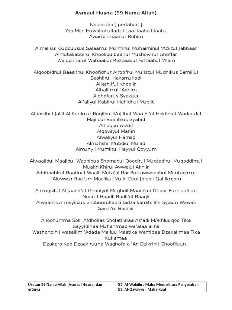 Jumlahnya 99 nama dan semuanya memiliki makna mendalam. Nadhom dapat juga diartikan sebagai mensyairkan sebuah teks teks arab dan teks latin asmaul husna menjadi pegangan saat sedang tidak hafal. Asma ul husna (99 nama allah). Lirik lagu teks asmaul husna latin 99 asmaul husna arab latin lengkap dan artinya fathulghofur com music lagu asmaul husna teks 100 free status wa lucu. Lirik asmaul husna oleh opick.